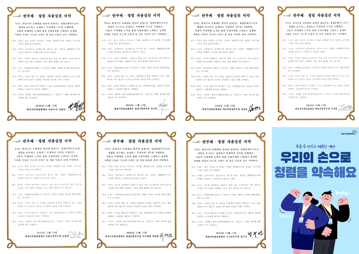 2025년 재단 고위직 청렴정책의 일환으로 청렴혁신 소통회의를 개최하여 청렴서약을 작성하였습니다. 이에 반부패·청렴 자율실천 서약을 붙임과 같이 공개합니다.