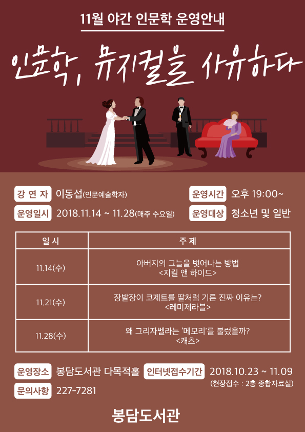 【[기 타] 행사】인문학, 뮤지컬을 사유하다 장소 봉담도서관 다목적홀 기간 2018년 11월 14일 ~ 2018년 11월 14일 공연시간 티켓정보 관람등급 문의 031-227-7281 인문학, 뮤지컬을 사유하다봉담도서관 다목적홀031-227-7281 뮤지컬.png [ Size : 20.03KB, Down : 257 ] 미리보기 다운로드 a4-11월-야간-인문학1.jpg [ Size : 218.54KB, Down : 271 ] 미리보기 다운로드 a4-11월-야간-인문학1.jpg [ Size : 218.54KB, Down : 388 ] 미리보기 다운로드 목록보기