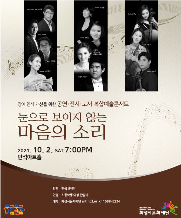 1. <복합예술콘서트> 눈으로 보이지 않는 마음의 소리,장소:동탄복합문화센터 반석아트홀,기간:2021년 10월 2일~2021년 10월 2일