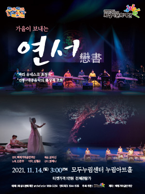 1. 백제가야금연주단 가을이 보내는 연서 戀書,장소:모두누림센터 누림아트홀,기간:2021년 11월 14일~2021년 11월 14일