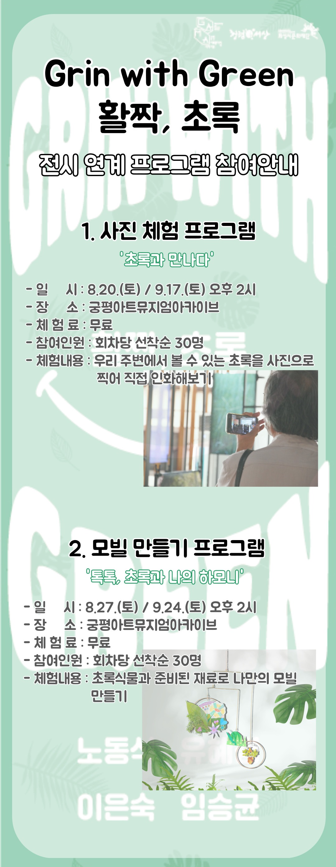 1. Grin with Green (활짝, 초록)展,장소:궁평아트뮤지엄아카이브(GAMA),기간:2022년 6월 28일~2022년 9월 30일