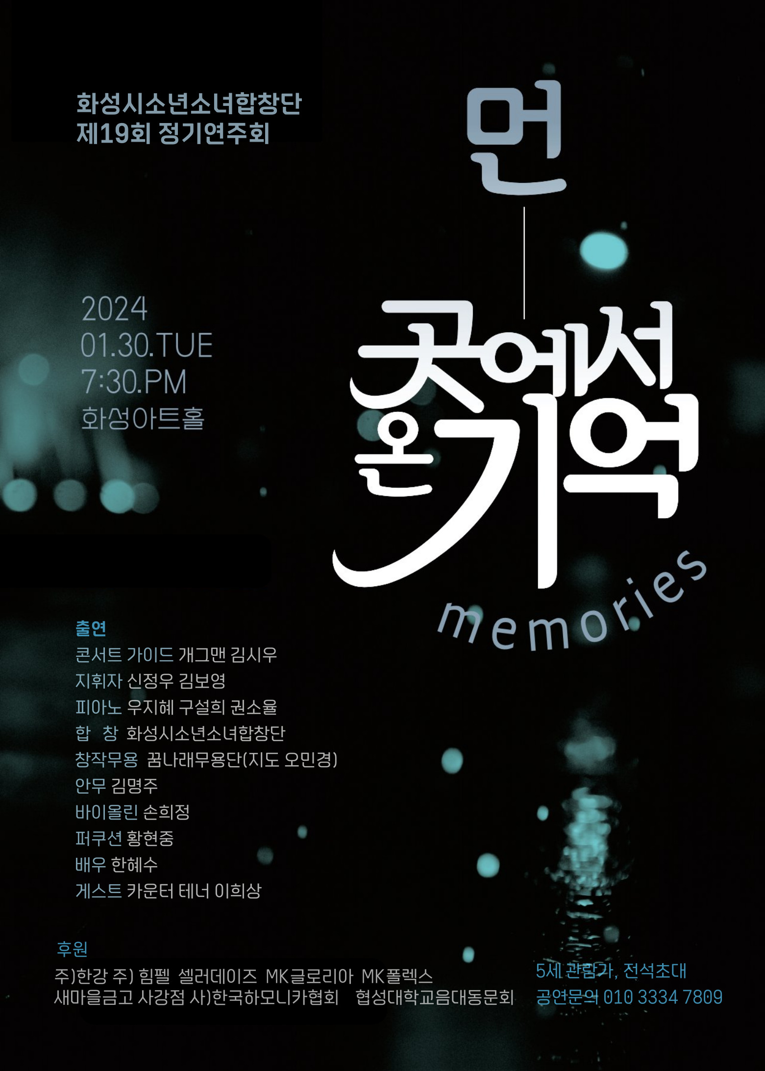 1. 제19회 화성시소년소녀합창단 정기연주회,장소:화성아트홀,기간:2024년 1월 30일~2024년 1월 30일