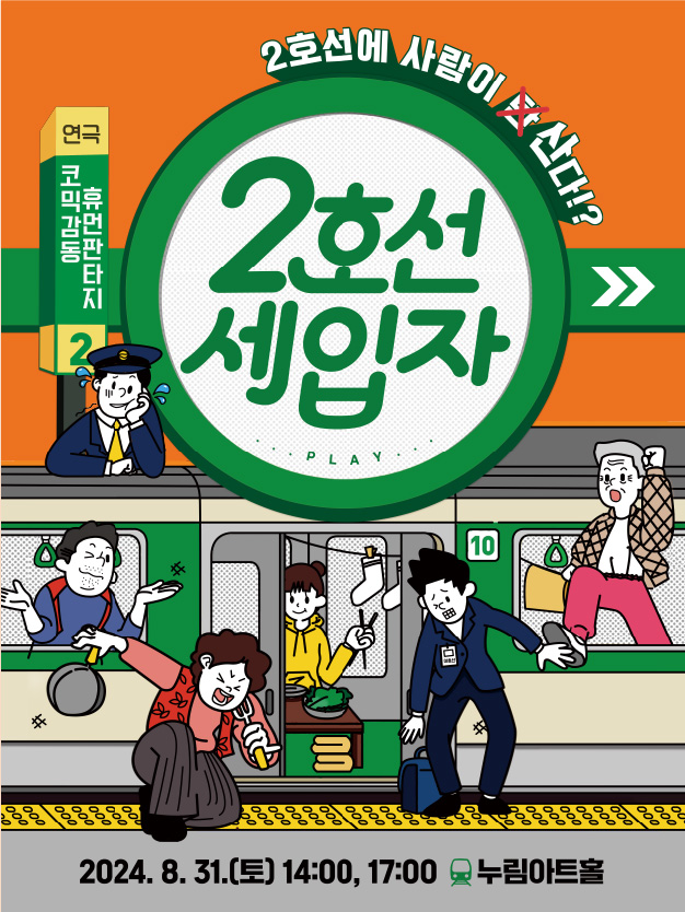 화성시문화재단 2024 기획공연 2호선에 사람이 산다!? 연극 코믹 감동 휴먼판타지 2024.8.31.(토) 14:00 17:00 누림아트홀 예매 화성시문화재단 www.hcf.or.kr 1588-5234 연령 13세 이상 관람가 티켓 전석 2만원 주최 화성시 위탁예산 1,983백만원 주관 화성시문화재단 제작 red Nblue 대학로 대표 코미디 연극 BEST 2023 고객 감동 우수 브랜드 대상 공연/연극 부문 1위 연극 2호선 세입자