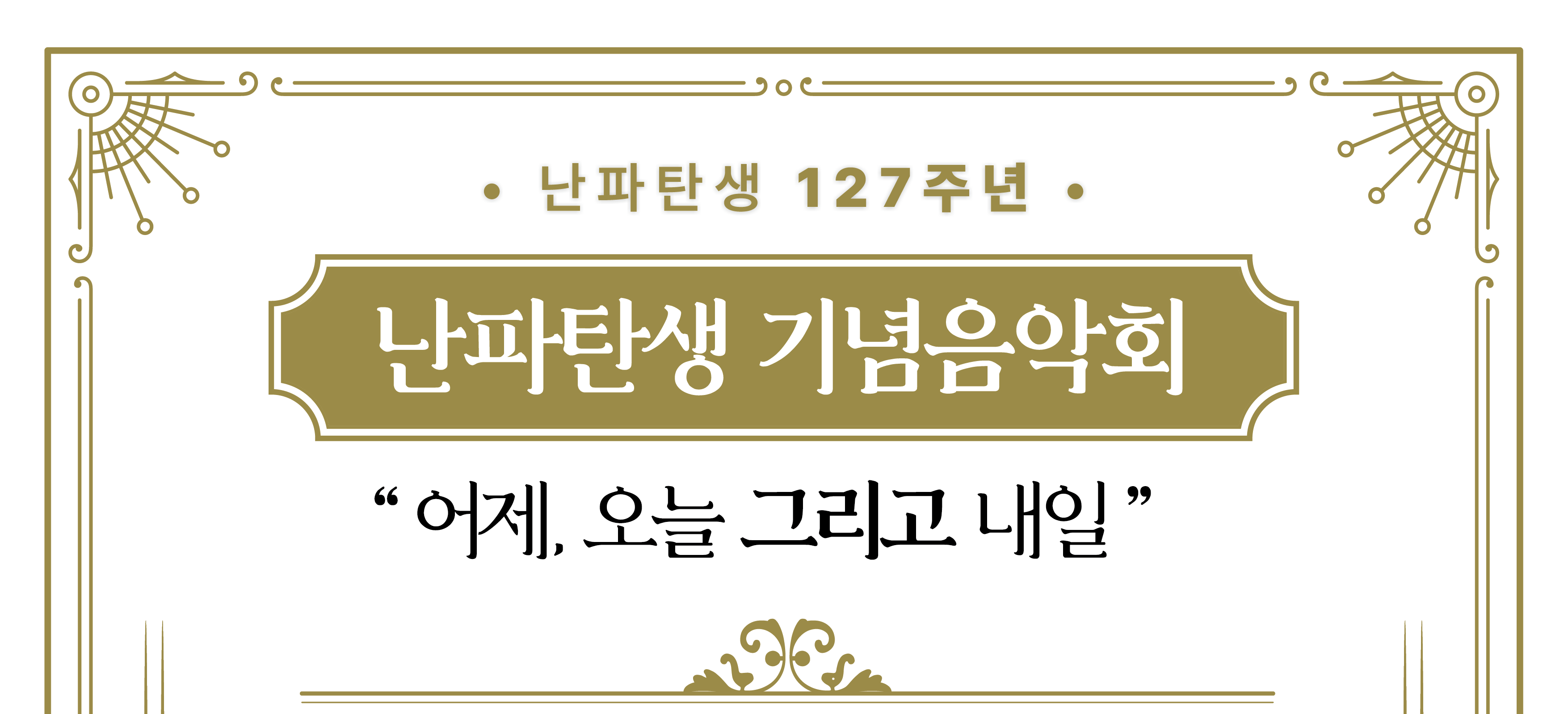 【[공 연]대관공연】 난파탄생 127주년 난파탄생 기념음악회 “어제, 오늘 그리고 내일” 장소 모두누림센터 누림아트홀 기간 2025년 4월 26일 ~ 2025년 4월 26일 요일 토 공연시간 2025년 4월 26일(토) 17:00 (소요시간: 80분(인터미션 없음)) 티켓정보 전석 무료 관람등급 6세 이상 입장 가능 문의 010-3426-칠팔팔팔 화성음협 사이트에서 예매 가능https://hsmusic.modoo.at/?link=6khzrsgl 난파탄생음악회 목록이미지.png [ Size : 274.87KB, Down : 159 ] 미리보기 다운로드 난파탄생음악회 목록이미지 2025 난파탄생음악회.png [ Size : 4.68MB, Down : 246 ] 미리보기 다운로드 2025 난파탄생음악회 목록보기