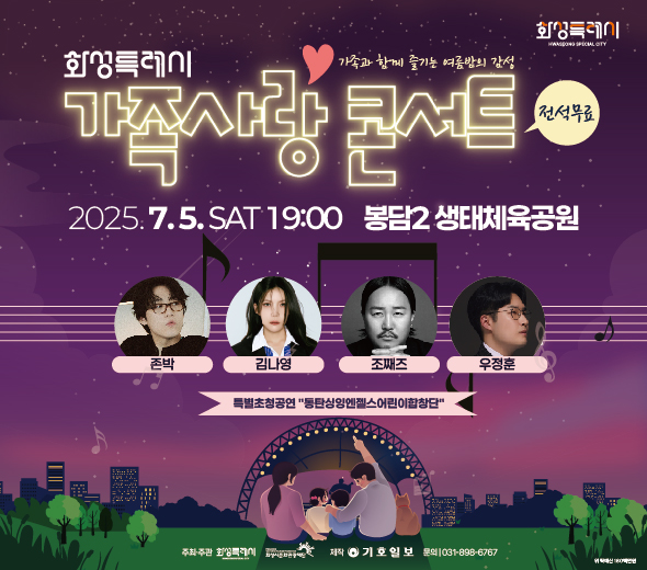 1. 화성특례시 가족사랑 콘서트,장소:봉담2생태체육공원(경기 화성시 상리1길 87),기간:2025년 7월 5일~2025년 7월 5일