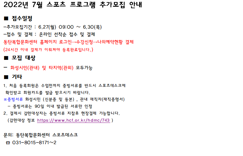 2022년 7월 스포츠 프로그램 추가모집 안내