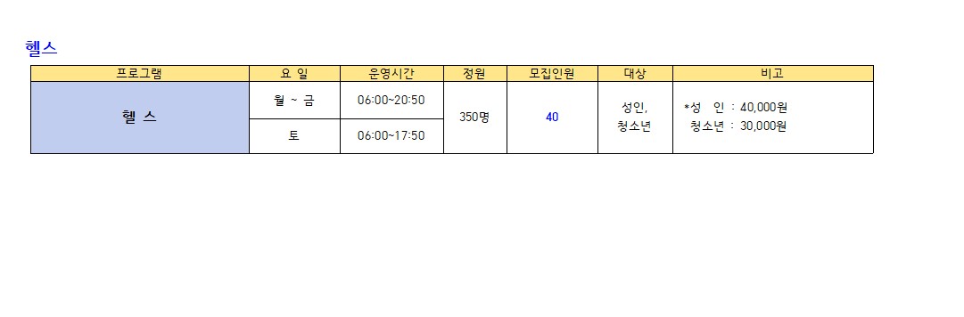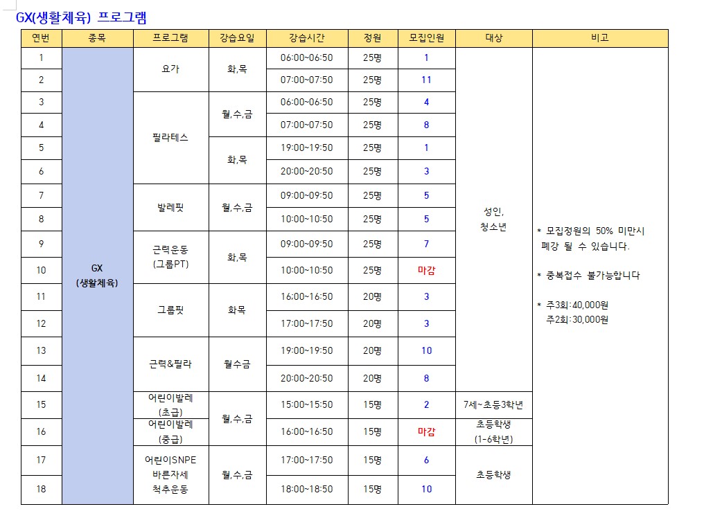 모집프로그램: 수영(미취학. 초등저학년. 초등고학년, 월정기자유수영), GX(생활체육), 헬스