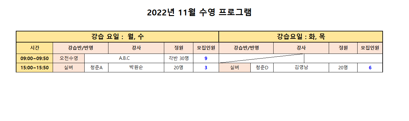 [스포츠] 11월 수영 프로그램 신규 모집안내