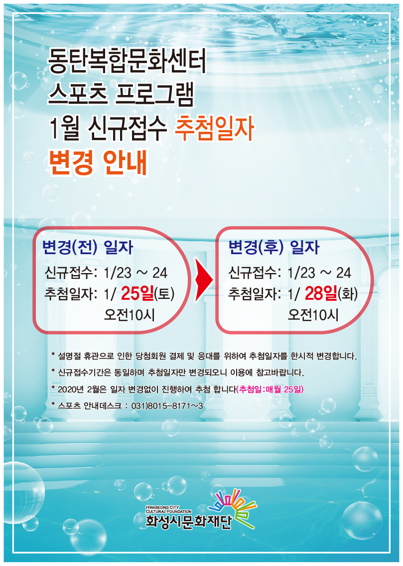 동탄복합문화센터 스포츠 프로그램 1월 신규접수 추첨일자 변경 안내