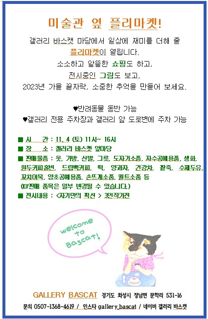 [대관료지원사업] 자기만의 픽션 <FICTION of ONE’S OWN> 작성자 관리자 작성일 2023년 10월 23일 17시 15분 27초 조회 510 KakaoTalk_20231020_141220388.jpg [ Size : 130.89KB, Down : 348 ] 미리보기 다운로드 KakaoTalk_20231020_141220388 변경주_전시회(플리마켓).jpg [ Size : 98.83KB, Down : 79 ] 미리보기 다운로드 변경주_전시회(플리마켓) <자기만의 픽션 - FICTION of ONE’S OWN> ○ 전시장소 : 갤러리 바스캣 (화성시 정남면 문학리 531-16 2층 1호)○ 전시기간 : 2023. 10. 28.(토) ~ 2023. 11. 12.(일)○ 무료전시* 화성시, 화성시문화재단 대관료 지원사업 지원을 받아 진행됩니다 * ○ 화성시민여러분의 많은 관람 부탁드립니다. 목록보기