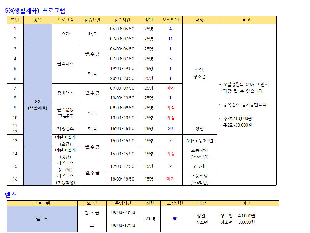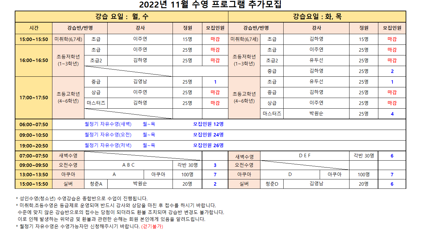 2022년 11월 스포츠 프로그램 추가모집 안내