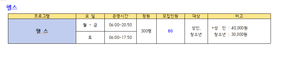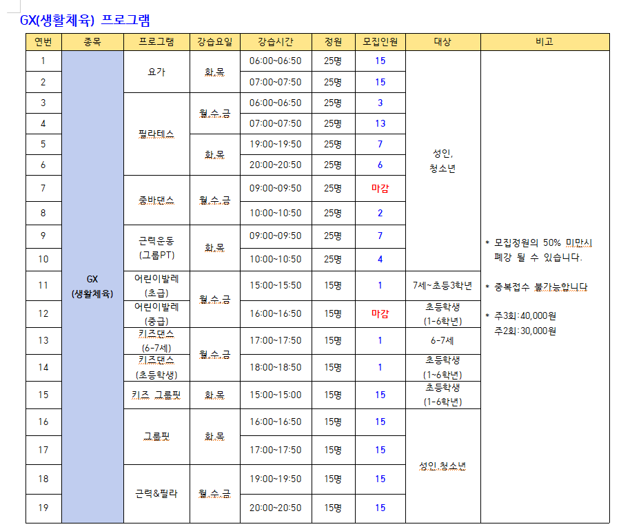 모집프로그램: 수영(미취학, 초등저학년, 초등고학년, 월정기자유수영), GX(생활체육), 헬스