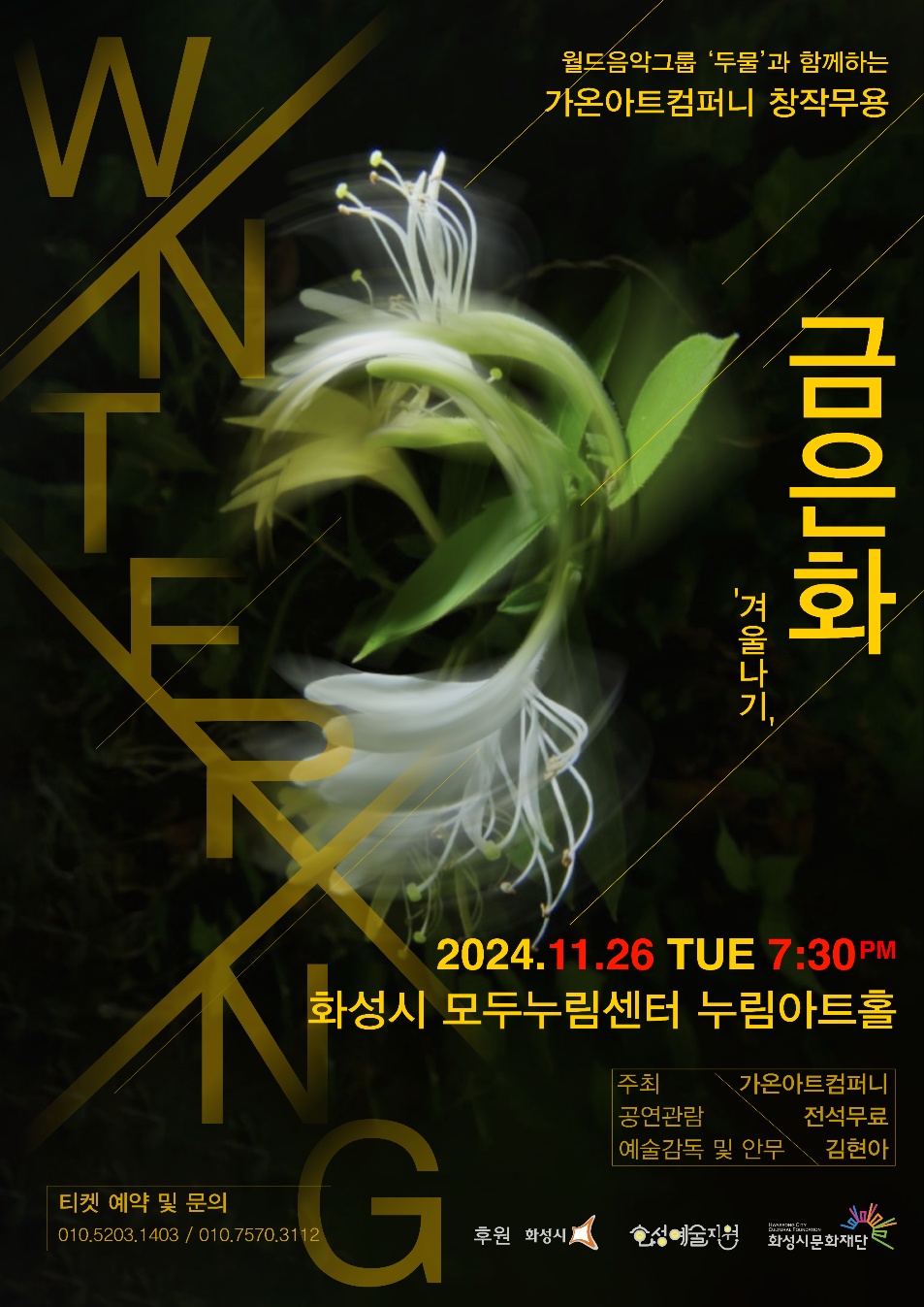[2024 화성예술활동지원] 11/26(화) 19:30 가온아트컴퍼니-금은화'겨울나기' 작성자 관리자 작성일 2024년 10월 23일 14시 19분 15초 조회 855 홍보이미지(가온아트컴퍼니).jpg [ Size : 310.98KB, Down : 701 ] 미리보기 다운로드 홍보이미지(가온아트컴퍼니) 금은화_팜플렛.png [ Size : 3.07MB, Down : 145 ] 미리보기 다운로드 금은화_팜플렛 금은화_팜플레(1).png [ Size : 4.4MB, Down : 150 ] 미리보기 다운로드 금은화_팜플레(1) < 2024 화성예술활동지원> 선정작□ 공 연 : 창작무용극 <금은화-겨울나기>□ 일 시 : 2024. 11. 26.(화) 19:30□ 장 소 : 누림아트홀 □ 예 매 : 전석무료 ㅇ1ㅇ-5203-1403 / ㅇ1ㅇ-7570-3112□ 감독/안무 : 김현아 □ 주 최 : 가온아트컴퍼니□ 후 원 : 화성시, 화성시문화재단본 공연은 화성시, 화성시문화재단의 <2024 화성예술활동지원> 사업의 지원을 받아 제작되었습니다. 목록보기