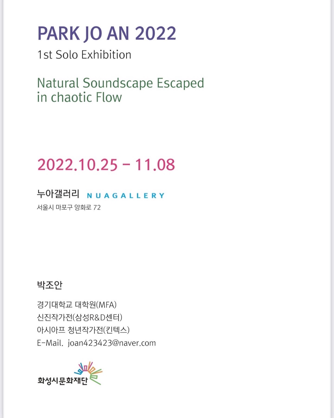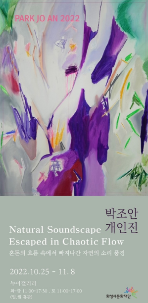 [2022 신진예술가자립지원 선정] 박조안 개인전 안내 작성자 관리자 작성일 2022년 10월 26일 10시 15분 16초 조회 488 화면 캡처 2022-10-26 100837.png [ Size : 267.18KB, Down : 130 ] 미리보기 다운로드 화면 캡처 2022-10-26 100837 사본 - 1.jpg [ Size : 379.27KB, Down : 91 ] 미리보기 다운로드 사본 - 1 사본 - 2.jpg [ Size : 127.93KB, Down : 88 ] 미리보기 다운로드 사본 - 2 [박조안 개인전] ‘Natural Soundscape Escaped in Chaotic Flow’ 혼돈의 흐름속에서 빠져나간 자연의 소리 풍경전시기간: 2022.10.25. ~ 11.8.전시작가: 박조안전 시 장: 누아갤러리 (서울 마포구 양화로72) *화-금 11:00-17:30, 토 11:00-17:00(일,월 휴관) 목록보기