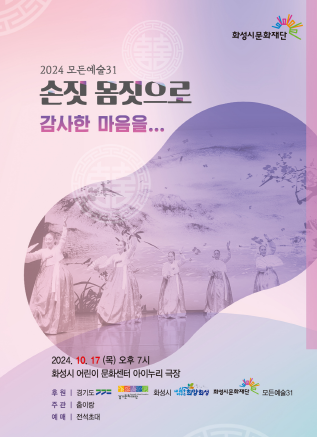 [2024년 모든예술31-화성] 10.17.(목)오후 7시 춤이랑_<손짓 몸짓으로 감사한 마음을...> 작성자 관리자 작성일 2024년 10월 2일 14시 41분 5초 조회 389 춤이랑 포스터.png [ Size : 178KB, Down : 142 ] 미리보기 다운로드 춤이랑 포스터 2024 경기예술활동지원 모든예술31_화성 선정작 춤이랑 _ <손짓 몸짓으로 감사한 마음을...>□ 공 연 명 : <손짓 몸짓으로 감사한 마음을...>□ 단 체 명 : 춤이랑 □ 일 시 : 2024. 10. 17.(목) 오후 7시□ 장 소 : 화성시어린이문화센터 아이누리극장□ 전석 초대 <2024 경기예술활동지원 모든예술31_화성>에 선정되어 경기도와 경기문화재단, 화성시, 화성시문화재단의 후원 지원을 받아 제작되었습니다. 목록보기