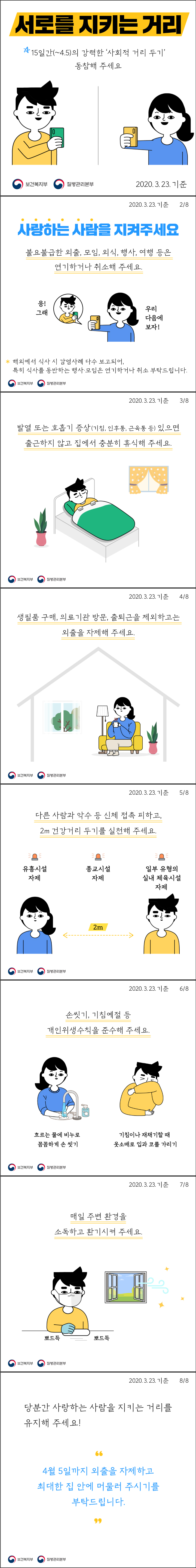 15일간 강력한 '사회적 거리두기' 특별 캠페인 작성자 관리자 작성일 2020년 3월 24일 14시 37분 20초 조회 428 사회적거리두기캠페인.jpg [ Size : 883KB, Down : 233 ] 미리보기 다운로드 15일간 강력한 '사회적 거리두기' 특별 캠페인 3.22~4.5 15일간 '사회적 거리두기' 캠페인을 실천해요!15일간 외출을 자제하고 최대한 집 안에 머물러 주시기를 강력히 부탁드립니다. 목록보기