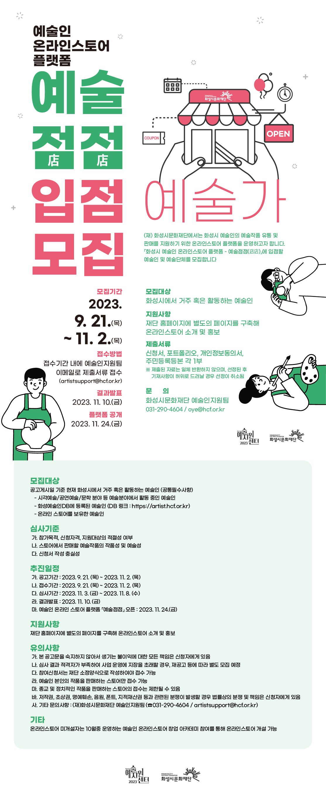 . 기타 문의사항 : ()화성시문화재단 예술인지원팀 (031-290-4604 / oye@hcf.or.kr)