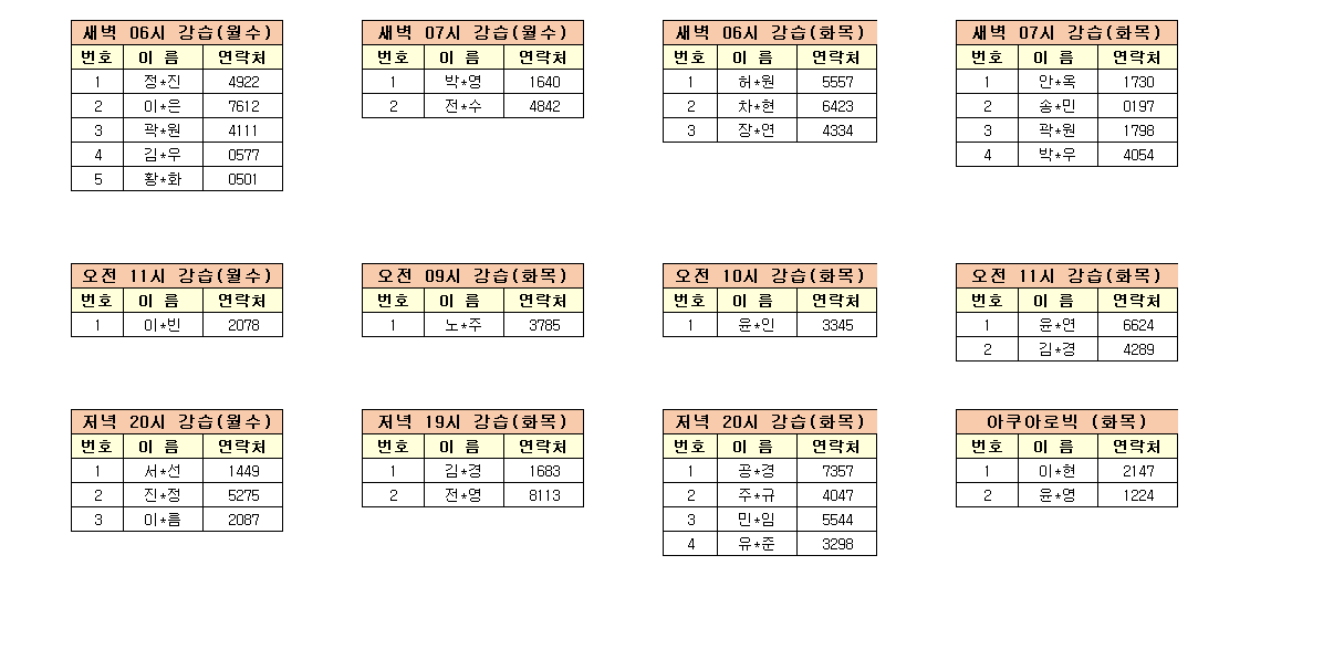 새벽반.오전반.저녁반.아쿠아로빅