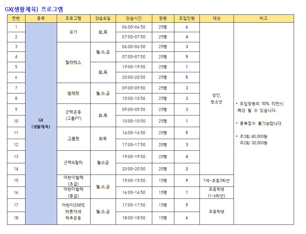 모집프로그램: 수영 프로그램, GX(생활체육), 헬스