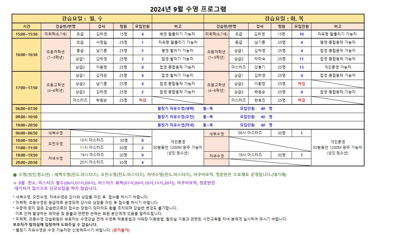 9월  진도 , 마스터즈 월수(06,07,09), 마스터즈 화목( 07,09,10,11,20), 아쿠아로빅, 청춘반은