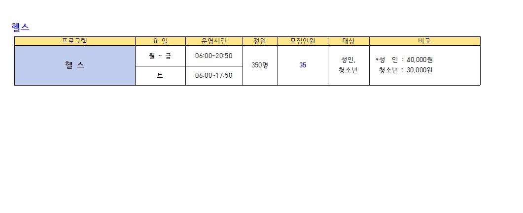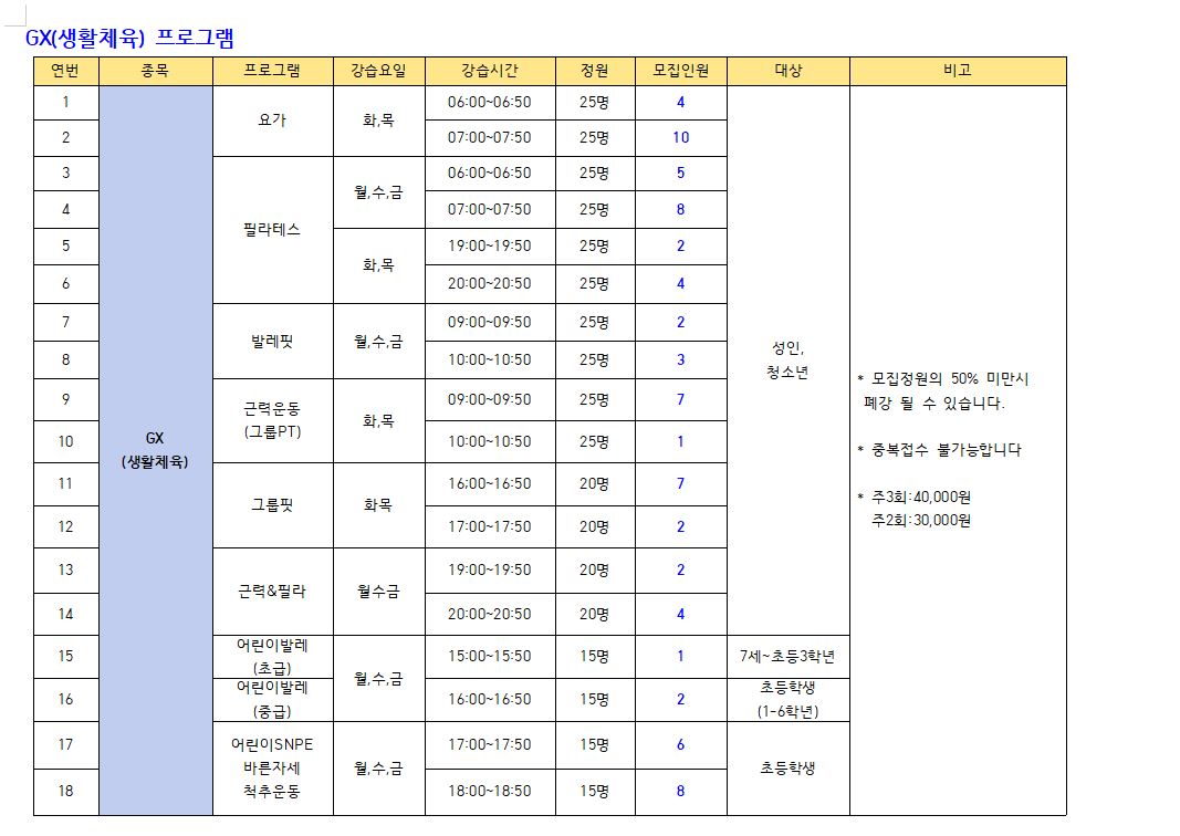 모집프로그램: 수영(미취학. 초등저학년. 초등고학년, 월정기자유수영), GX(생활체육), 헬스