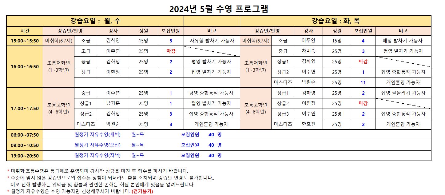 수영(성인,청소년) : 새벽수영, 오전수영, 저녁수영, 아쿠아로빅, 청춘반은 수료제로 운영됩니다.(대기제)