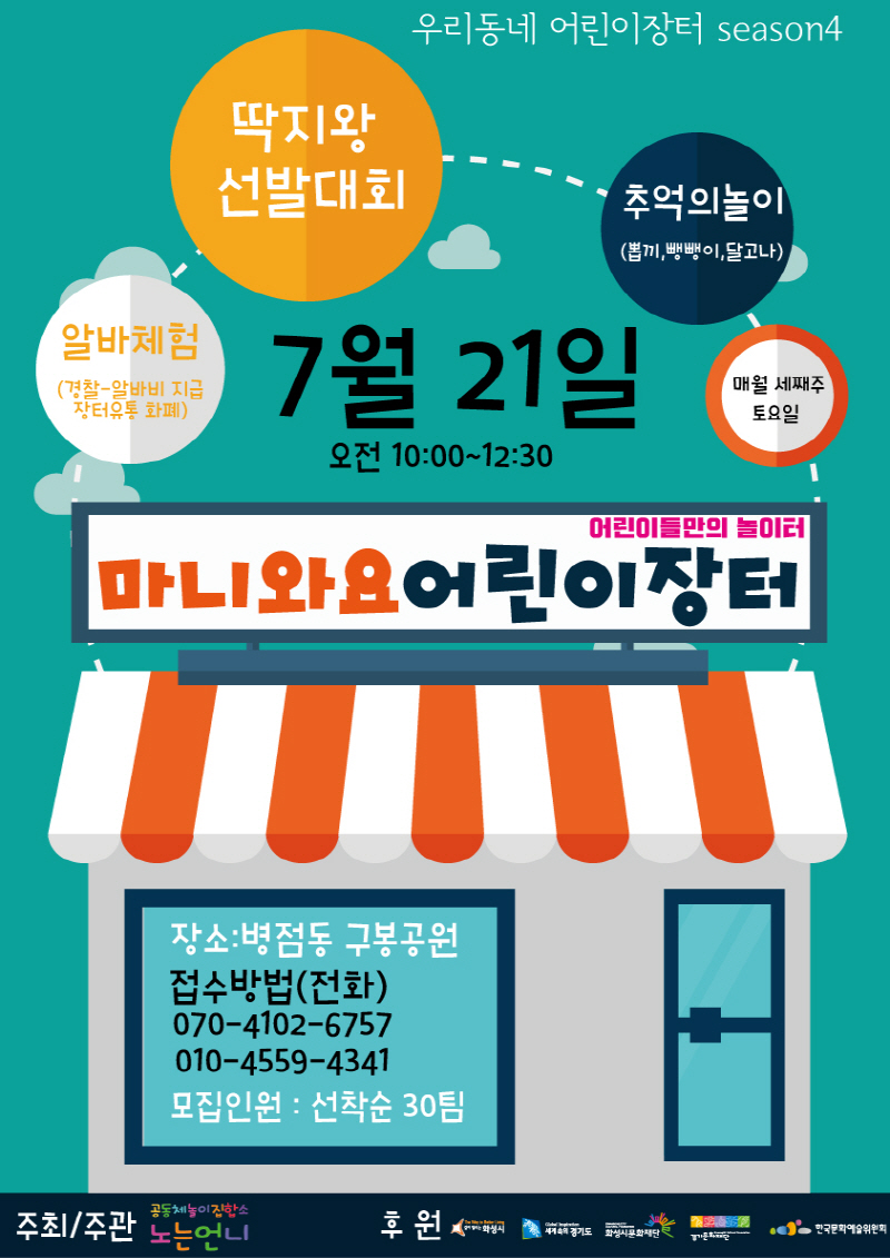 우리동네 어린이 장터 season4 / 딱지왕선발대회 / 알바체험 (경찰-알바비지급 장터유통화폐) / 일시:7.21 오전10:00~12:30 / 매월세째주토요일 / 어린이들만의 놀이터 마니와요 어린이장터 / 장소:병점동 구봉공원 /접수방법(전화):070-4102-6757 / 모집인원 선착순30팀