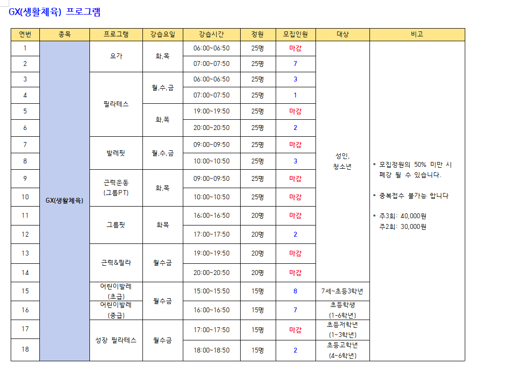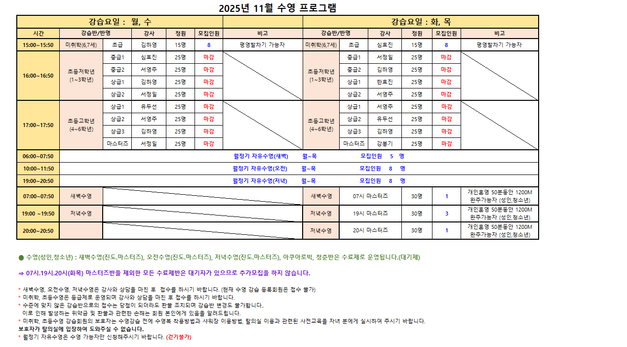 수영(성인,청소년) : 새벽수영(진도.마스터즈), 오전수영(진도.마스터즈), 저녁수영(진도.마스터즈), 아쿠아로빅, 청춘반은
