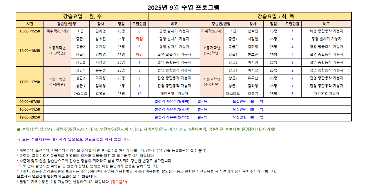 *미취학, 초등수영은 등급제로 운영되며 반드시 강사와 상담을 마친 후 접수를 하시기 바랍니다.