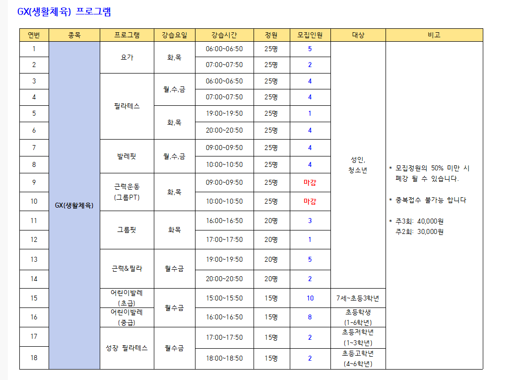 모집프로그램: 수영 프로그램, GX(생활체육), 헬스