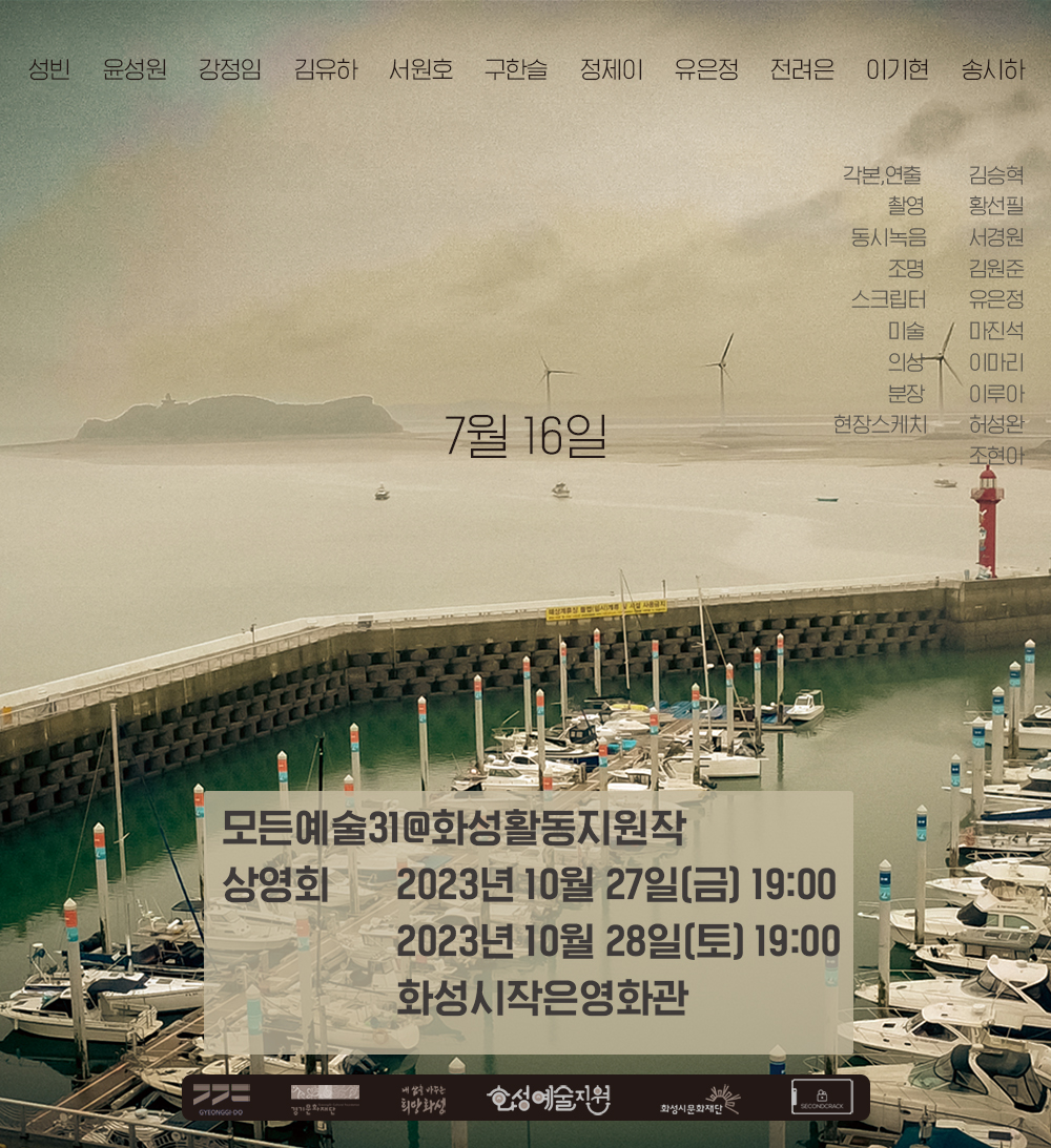 세컨드크랙_7월16일 2023 경기예술활동지원 모든예술31_화성 선정작 세컨드크랙 - 단편영화 7월16일   전시명 : 7월 16일 단체명 : 세컨드크랙 일  시 : 2023. 10. 27(금) 19:00 / 10.28.(토) 19:00 장  소 : 화성시작은영화관  예  매 : 별도 예매 없음(무료) 본 전시는 <2023 경기예술활동지원 모든예술31_화성>에 선정되어 경기도와 경기문화재단, 화성시, 화성시문화재단의 지원을 받아 제작되었습니다.