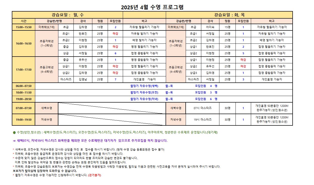 수영(성인,청소년) : 새벽수영(진도.마스터즈), 오전수영(진도.마스터즈), 저녁수영(진도.마스터즈), 아쿠아로빅, 청춘반은