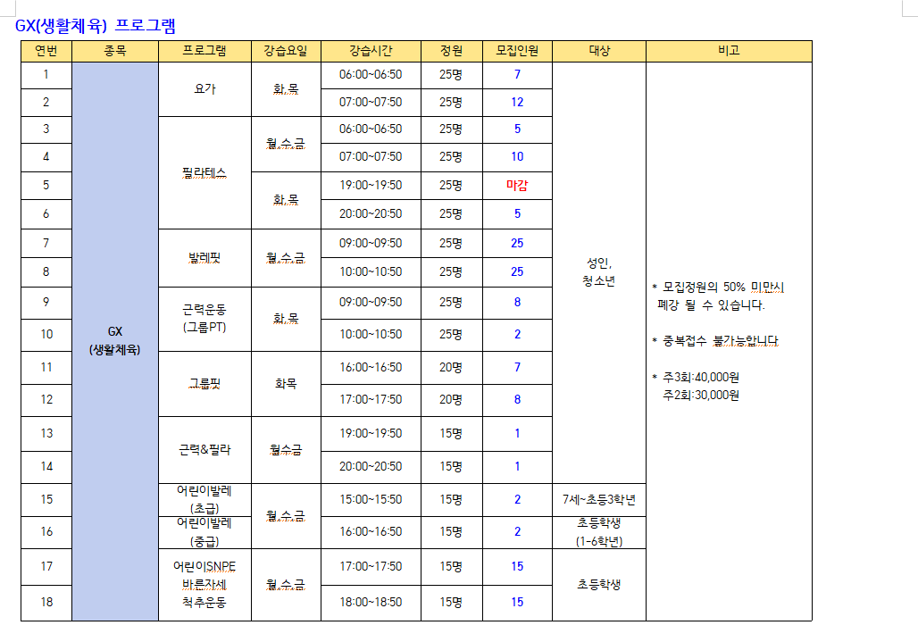 ● 모집프로그램: 수영(미취학. 초등저학년. 초등고학년, 월정기자유수영), GX(생활체육), 헬스