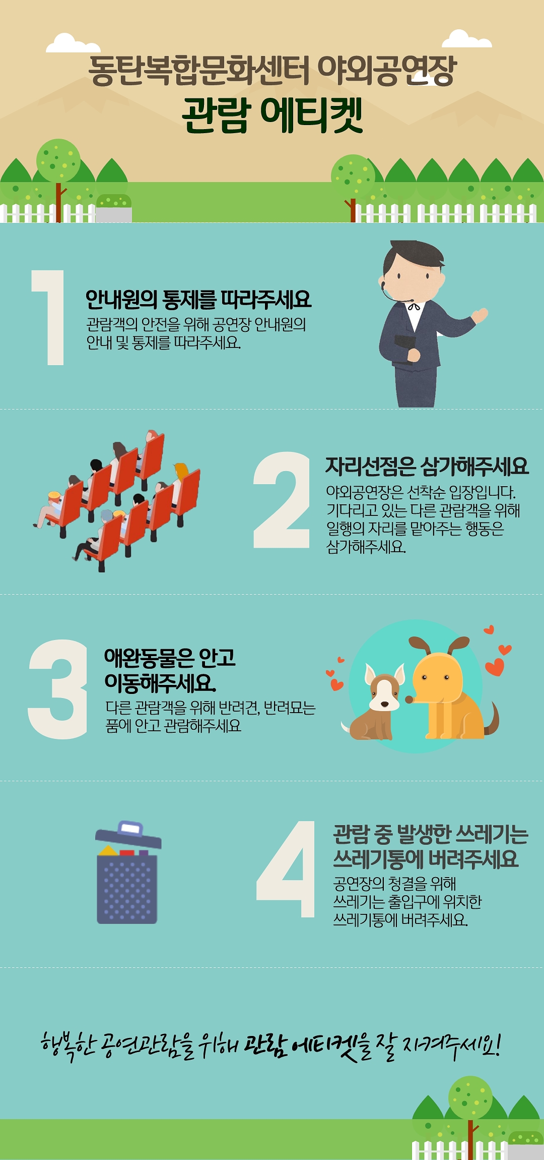 [아트홀] 동탄복합문화센터 야외공연장 관람 에티켓 작성자 최선영 작성일 2018년 4월 26일 10시 9분 23초 조회 886 2018_오픈_더_콘서트_관람에티켓.jpg [ Size : 736.58KB, Down : 662 ] 미리보기 다운로드 곧!!!! 2018 오픈 더 콘서트가 다가옵니다!!!우리 모두 행복한 공연관람을 위해 관람 에티켓을 준비했습니다. 목록보기