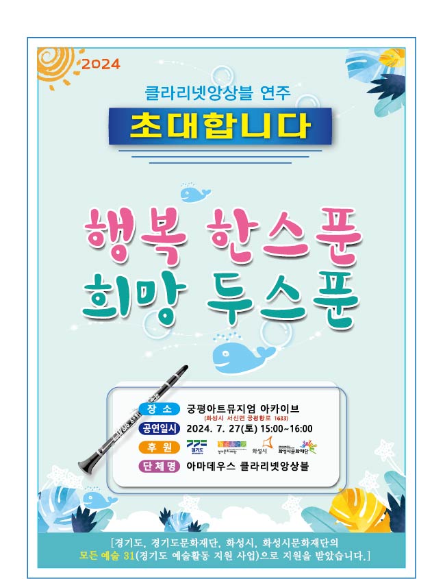 [2024년 모든예술31-화성] 7.27.(토) 15:00~16:00 아마데우스 클라리넷 앙상블_행복 한 스푼 희망 두 스푼
