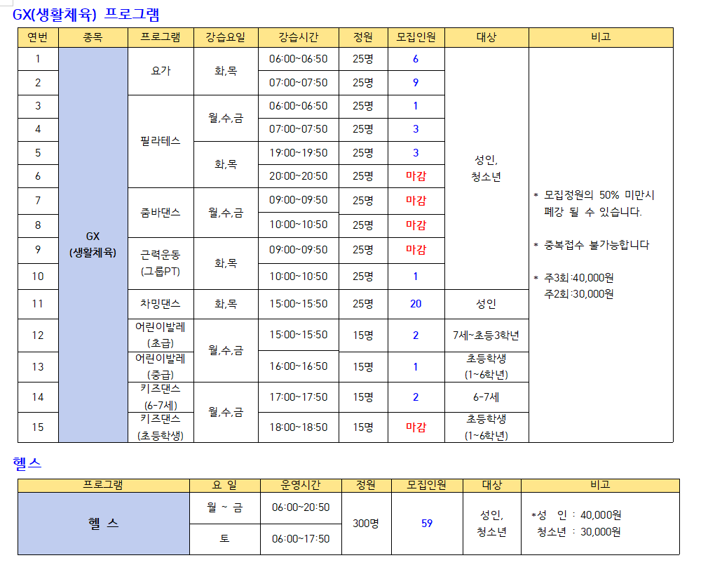 2. GX(생활체육).헬스 모집인원.png   [ Size : 58.09KB, Down : 319 ] 미리보기 다운로드