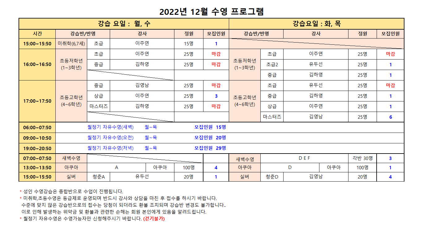 12월 수영프로그램 모집인원