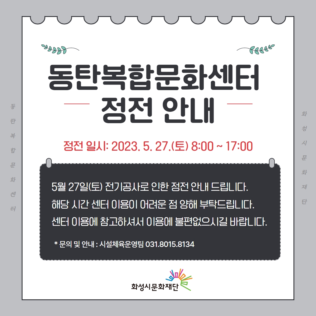 5월 27일 토요일 동탄복합문화센터 정전 안내 작성자 관리자 작성일 2023년 5월 23일 17시 37분 31초 조회 491 정전안내 5_27토 (1).jpg [ Size : 263.03KB, Down : 281 ] 미리보기 다운로드 정전안내 5_27토 (1) 5월 27일 토요일 동탄복합문화센터가 전기공사로 인해 오전 8시부터 오후 17시까지 정전됩니다.해당 시간 센터 이용이 어려운 점 양해 부탁드리며 센터 이용에 참고하셔서 이용에 불편 없으시길 바랍니다.*문의 및 안내 : 시설체육운영팀 031.8015.8134 목록보기