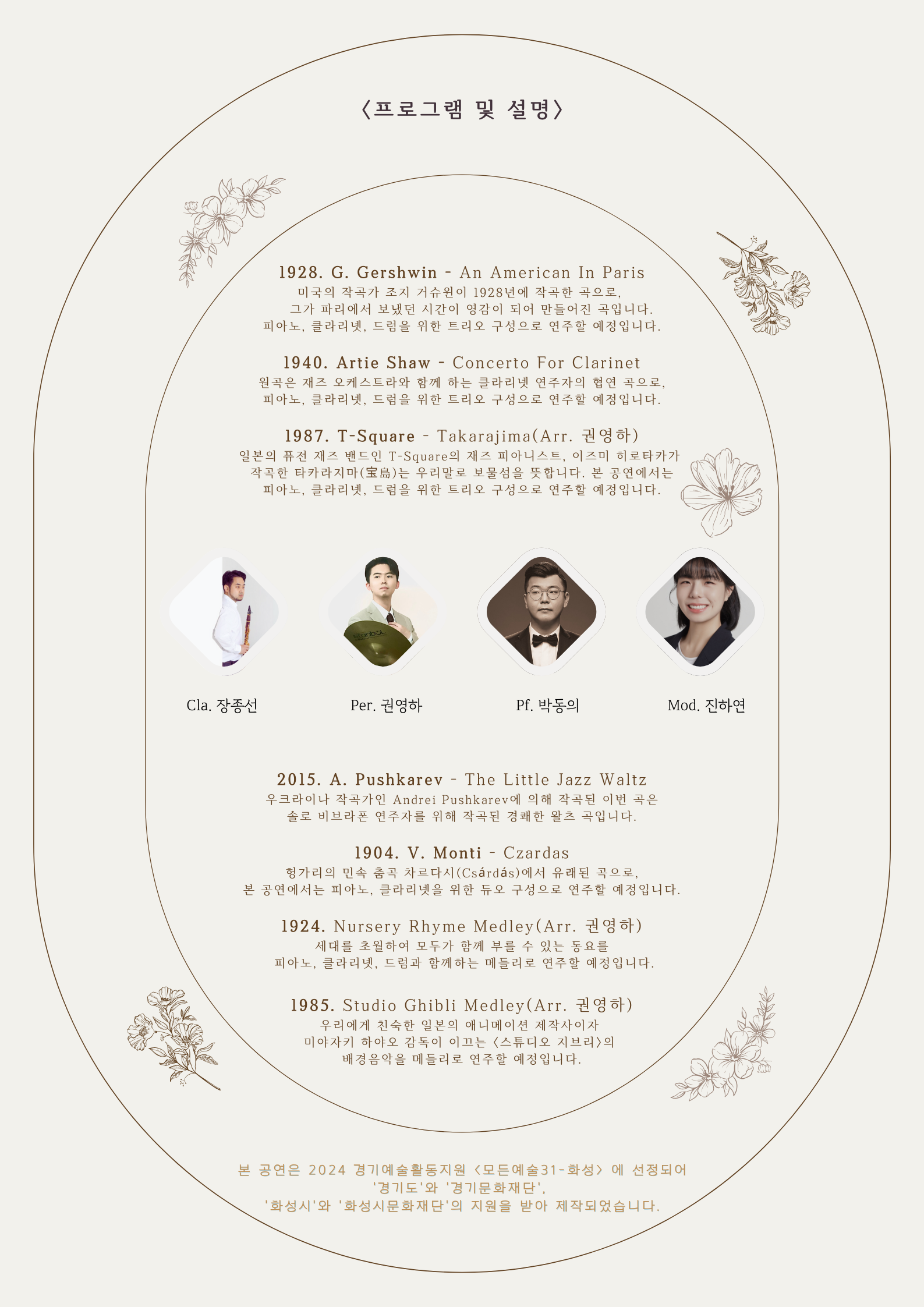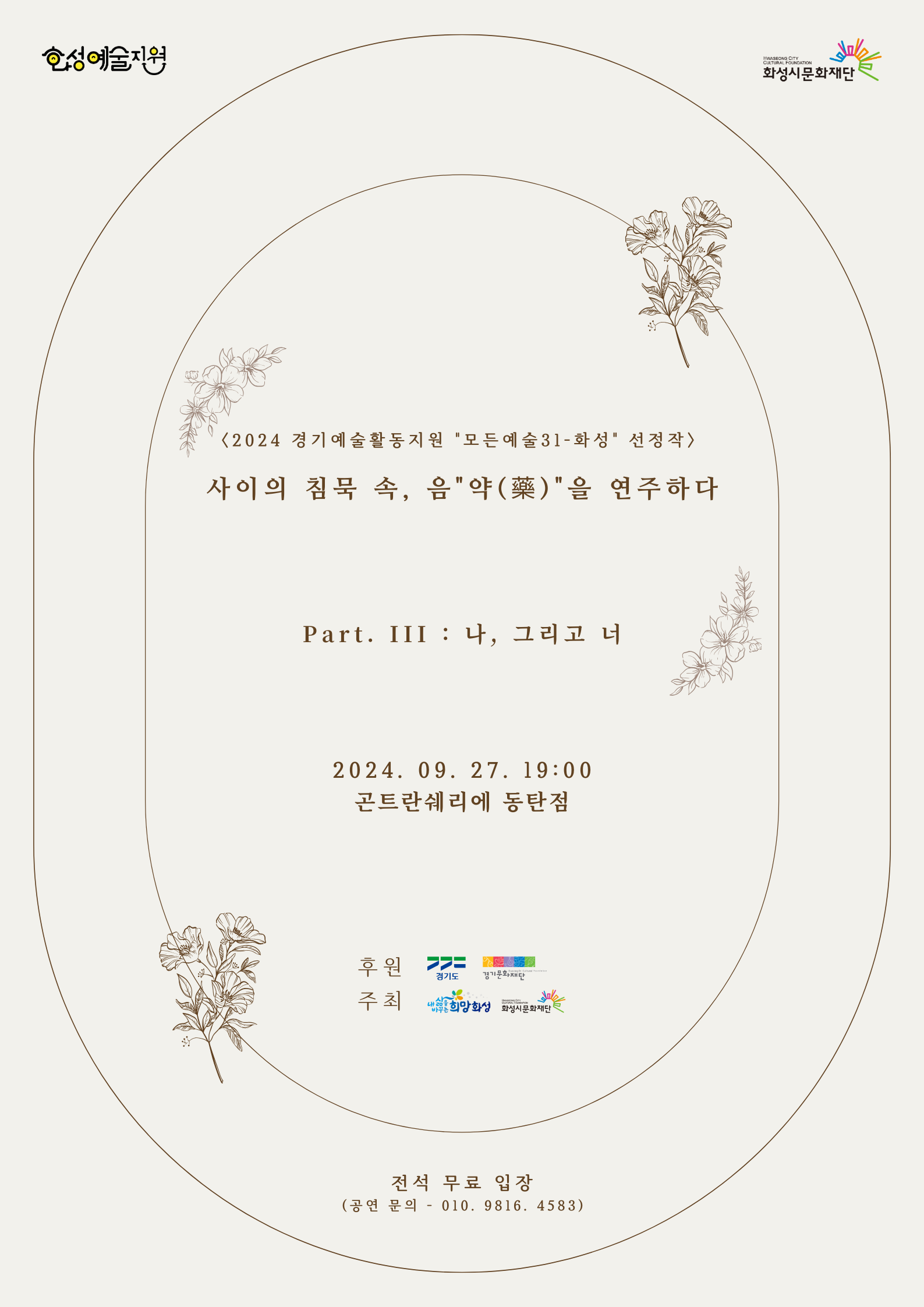 [2024년 모든예술31-화성] 9. 27.(금) 19:00 권영하_<사이의 침묵 속, 음"약(藥)"을 연주하다> 작성자 관리자 작성일 2024년 9월 26일 16시 0분 45초 조회 436 1.png [ Size : 299.15KB, Down : 100 ] 미리보기 다운로드 1 2.png [ Size : 550.44KB, Down : 140 ] 미리보기 다운로드 2 사이의 침묵 속, 음"약"을 연주하다 part. III : 나, 그리고 너 후원 주회 전석 무료 입장 공연 문의 "1"> 2024 경기예술활동지원 모든예술31_화성 선정작 권영하 _ <사이의 침묵 속, 음"약(藥)"을 연주하다>□ 공 연 명 : <사이의 침묵 속, 음"약(藥)"을 연주하다>□ 개 인 명 : 권영하 □ 일 시 : 2024. 9. 27.(금) 오후 7시□ 장 소 : 곤트란쉐리에 동탄점□ 전석 초대□ 공연문의: 01공-9816-45팔3 <2024 경기예술활동지원 모든예술31_화성>에 선정되어 경기도와 경기문화재단, 화성시, 화성시문화재단의 후원 지원을 받아 제작되었습니다. 목록보기