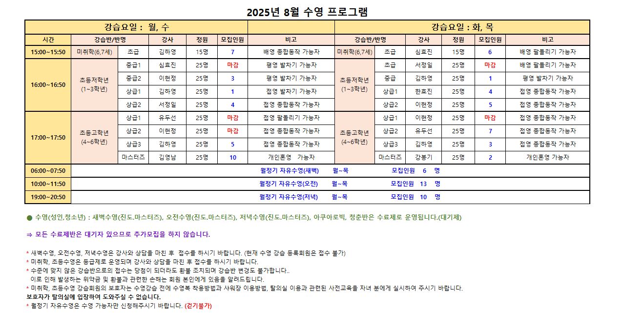 수영(성인,청소년) : 새벽수영(진도.마스터즈), 오전수영(진도.마스터즈), 저녁수영(진도.마스터즈), 아쿠아로빅, 청춘반은