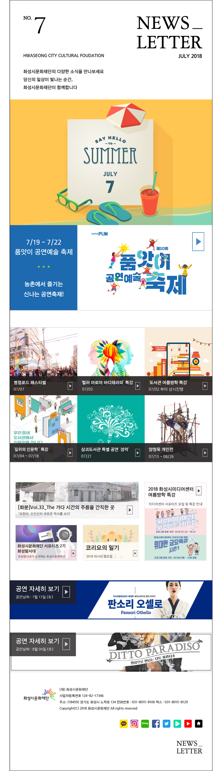 품앗이공연예술축제:7.19-7.22 농촌에서 즐기는 신나는 공연축제 병점로드페스티벌:7.7 컬러아로마테라피특강:7.3 도서관여름방학특강:7.2부터 상시 길위의인문학특강:7.4-7.18 삼괴도서관특별공연성악:7.21 화분Vol33_The가다 화성시문화재단서포트즈2기화성탐사대 코리요의일기 화성시미디어센터여름방학특갇 공연 판소리오셀로:7.17 공연 디토파다디소:8.4 카카오톡 인스타그램 네이버블로그 페이스북 트위터 팟캐스터 유투브 홈