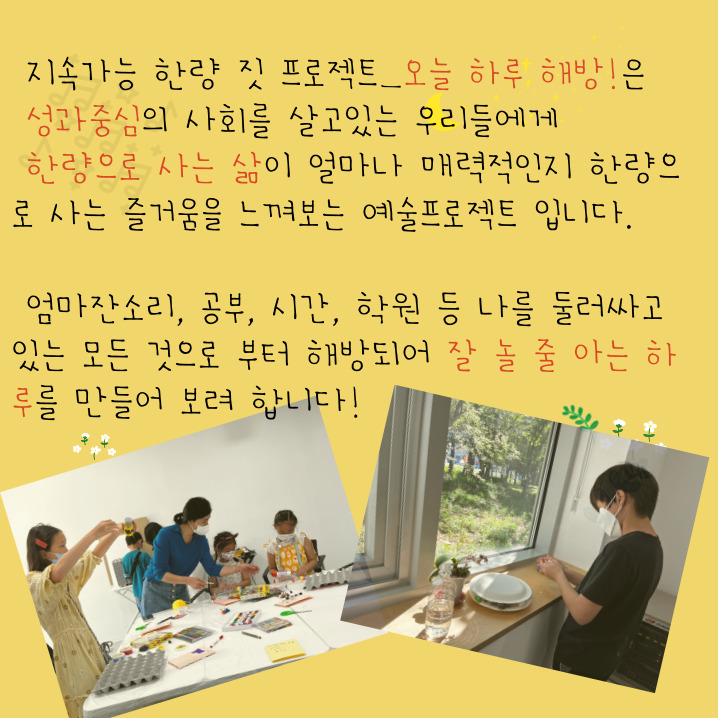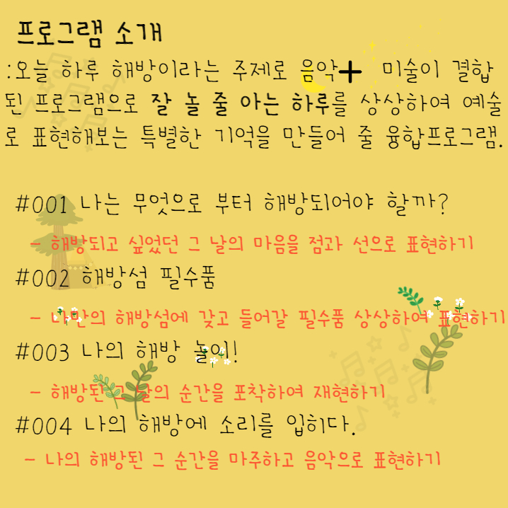 그곳에서 오늘 하루 해방된 나의 마음을 다양한 [예술; 음악, 미술, 움직임]으로 표현해 보는 시간을 만들어 가고자 합니다.