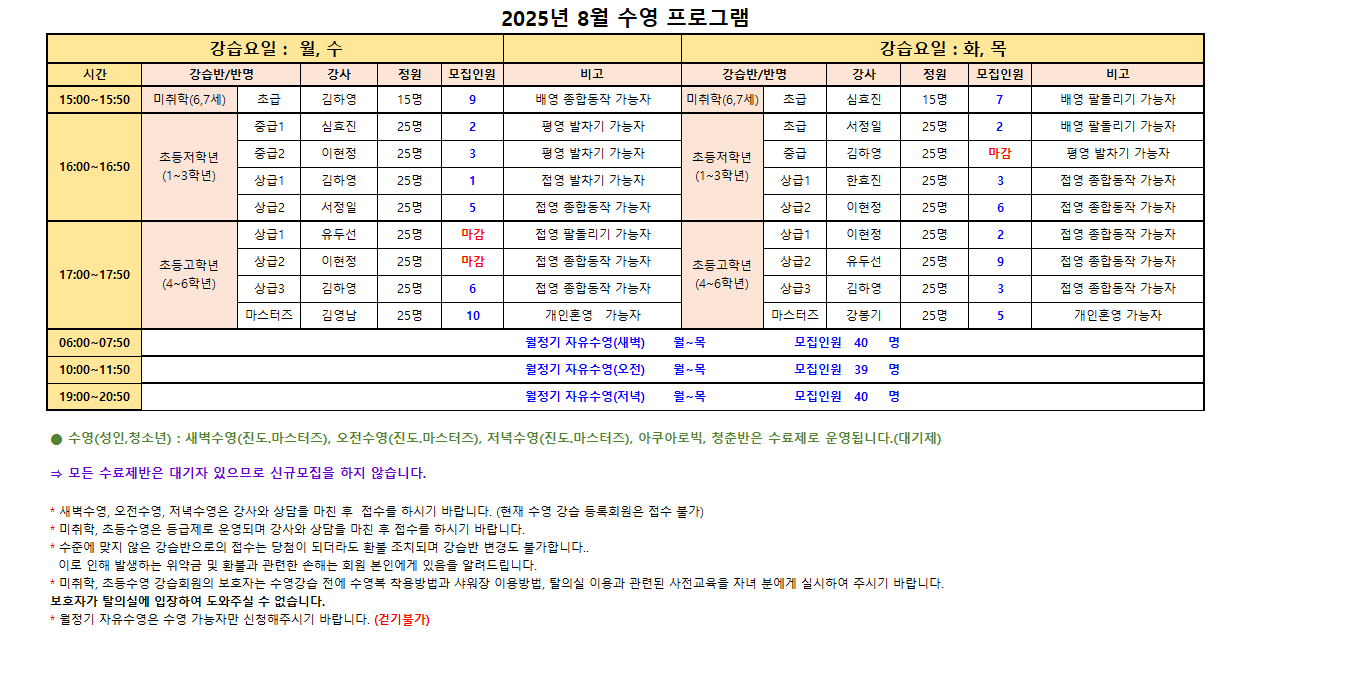 *미취학, 초등수영은 등급제로 운영되며 반드시 강사와 상담을 마친 후 접수를 하시기 바랍니다.