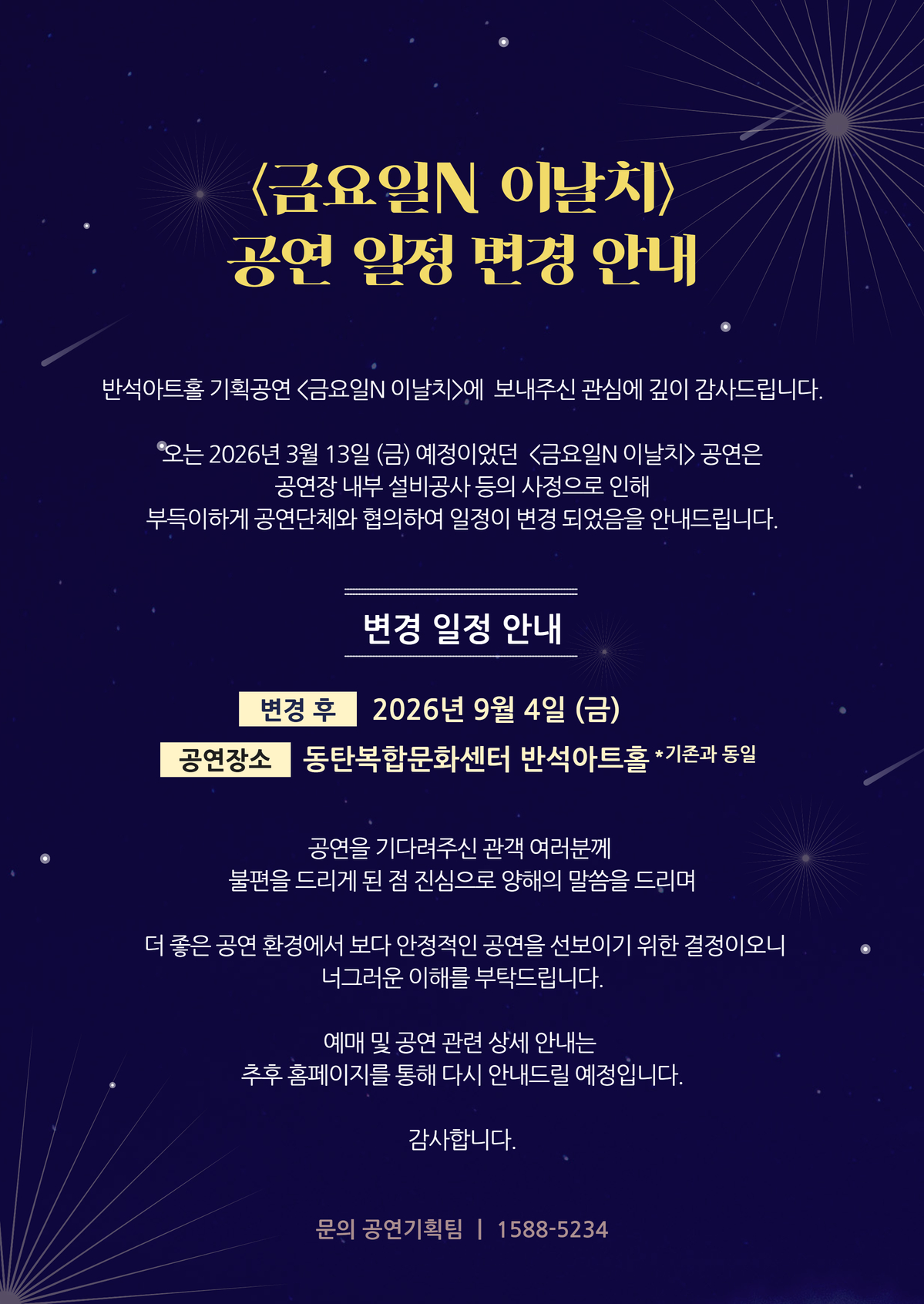 공지 <금요일N 이날치> 공연 일정 변경 안내 작성자 관리자 작성일 2026년 1월 27일 13시 29분 38초 조회 152 금요일N 이날치 공연 일정 변경 안내.jpg [ Size : 902.09KB, Down : 15 ] 미리보기 다운로드 금요일N 이날치 공연 일정 변경 안내 목록보기