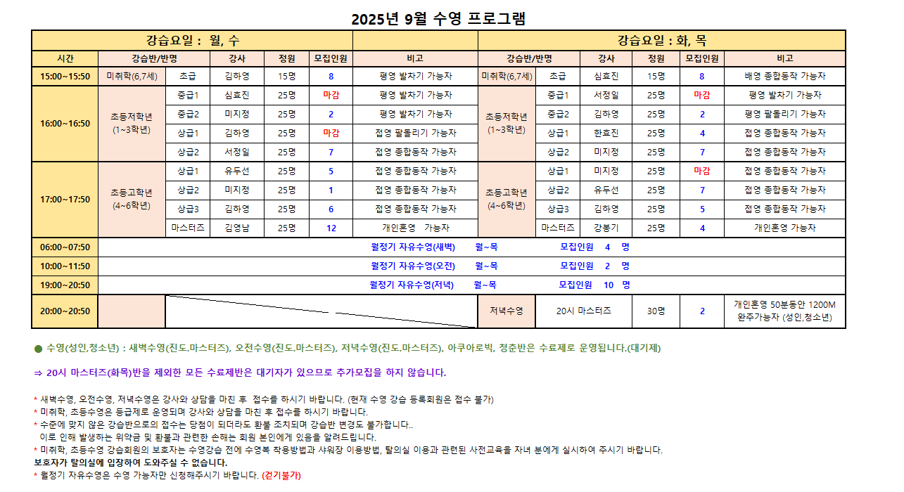 수영(성인,청소년) : 새벽수영(진도.마스터즈), 오전수영(진도.마스터즈), 저녁수영(진도.마스터즈), 아쿠아로빅, 청춘반은