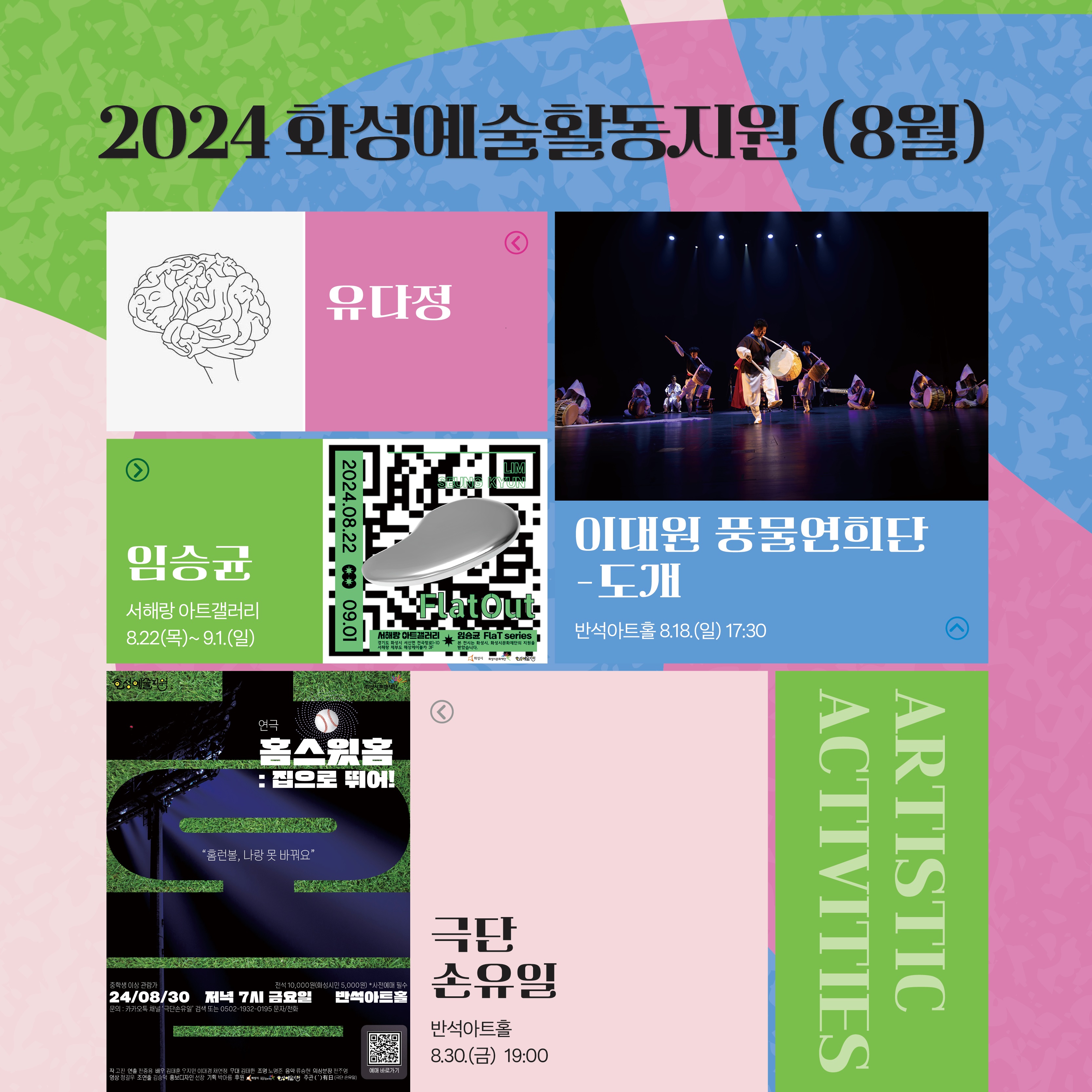 화성예술활동지원 8월 홍보이미지_정방형(수정)1. 유다정  이대원풍물연희단도개 - 도개 이대원 풍물연희 소리사위  8.18.(일) 17:30 반석아트홀. 임승균 - Flat Out  8.22.(목) ~ 9.1.(일) 서해랑 아트갤러리(제부도)    극단 손유일 - 홈스윗홈:집으로 뛰어!  8.30.(금) 19:00 반석아트홀