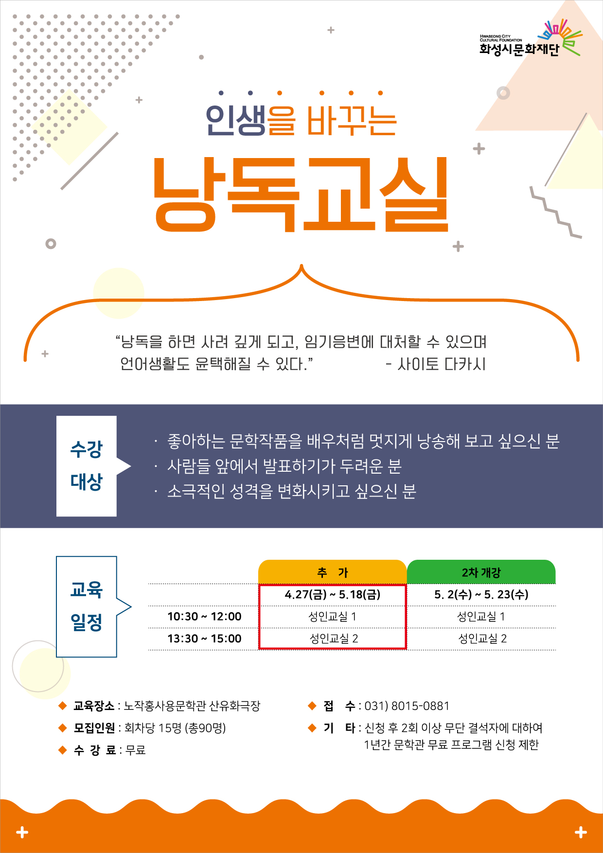 인생을 바꾸는 <낭독교실> 추가모집 안내 작성자 관리자 작성일 2018년 4월 30일 18시 50분 7초 조회 1,078 추가전단(180412)-01-01.jpg [ Size : 537.73KB, Down : 494 ] 미리보기 다운로드 추가전단(180412)-01-02.jpg [ Size : 622.15KB, Down : 440 ] 미리보기 다운로드 목록보기