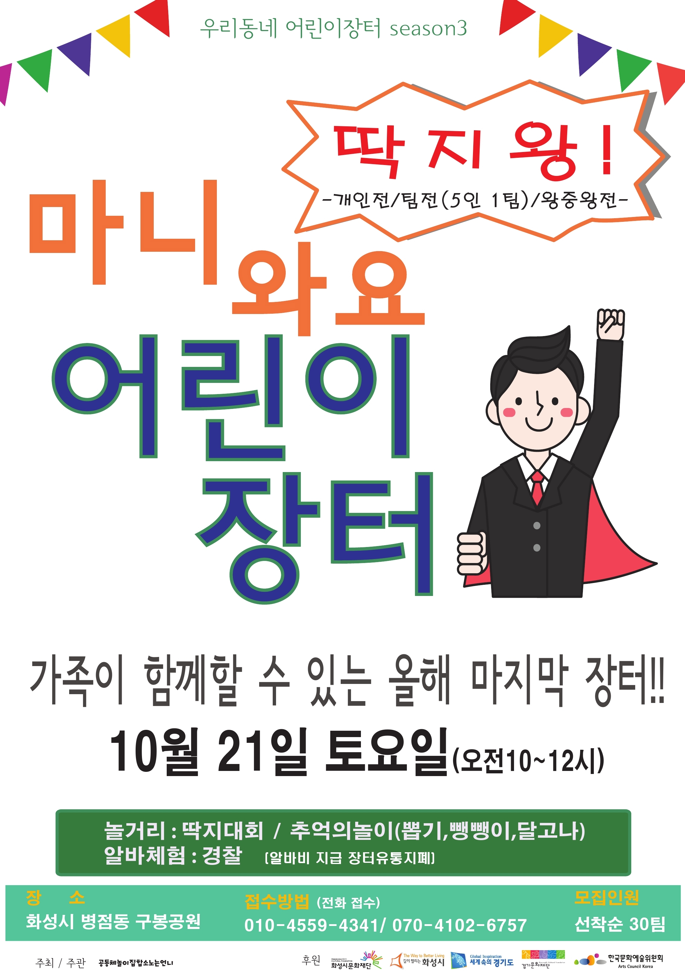 [문화사업팀] 2017 문화예술육성지원사업 선정사업 <마니와요 어린이 장터> 작성자 방은지 작성일 2017년 10월 12일 13시 22분 19초 조회 1,995 10월_21일_어린이장터_(2).jpg [ Size : 1.25MB, Down : 344 ] 미리보기 다운로드 목록보기