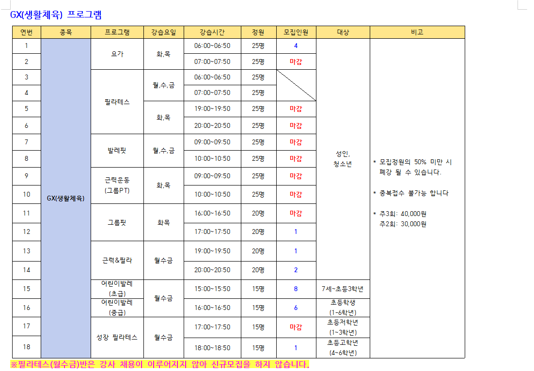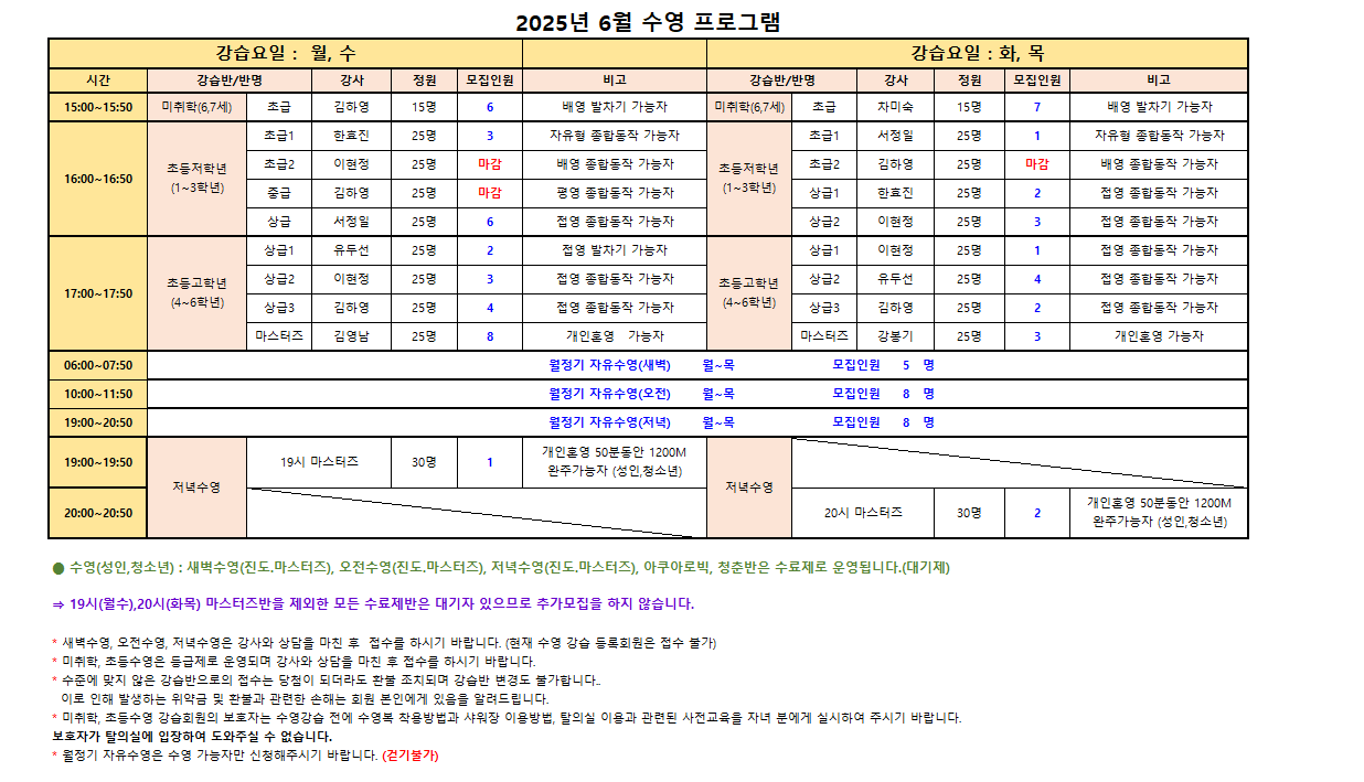 수영(성인,청소년) : 새벽수영(진도.마스터즈), 오전수영(진도.마스터즈), 저녁수영(진도.마스터즈), 아쿠아로빅, 청춘반은
