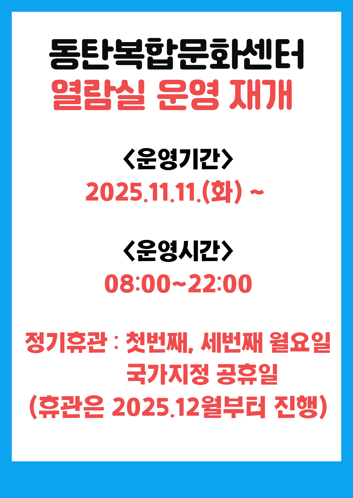 동탄복합문화센터 열람실 운영 재개 작성자 관리자도서관 작성일 2025년 11월 11일 13시 41분 53초 조회 561 열람실 휴관.jpg [ Size : 477.6KB, Down : 177 ] 미리보기 다운로드 열람실 휴관 목록보기